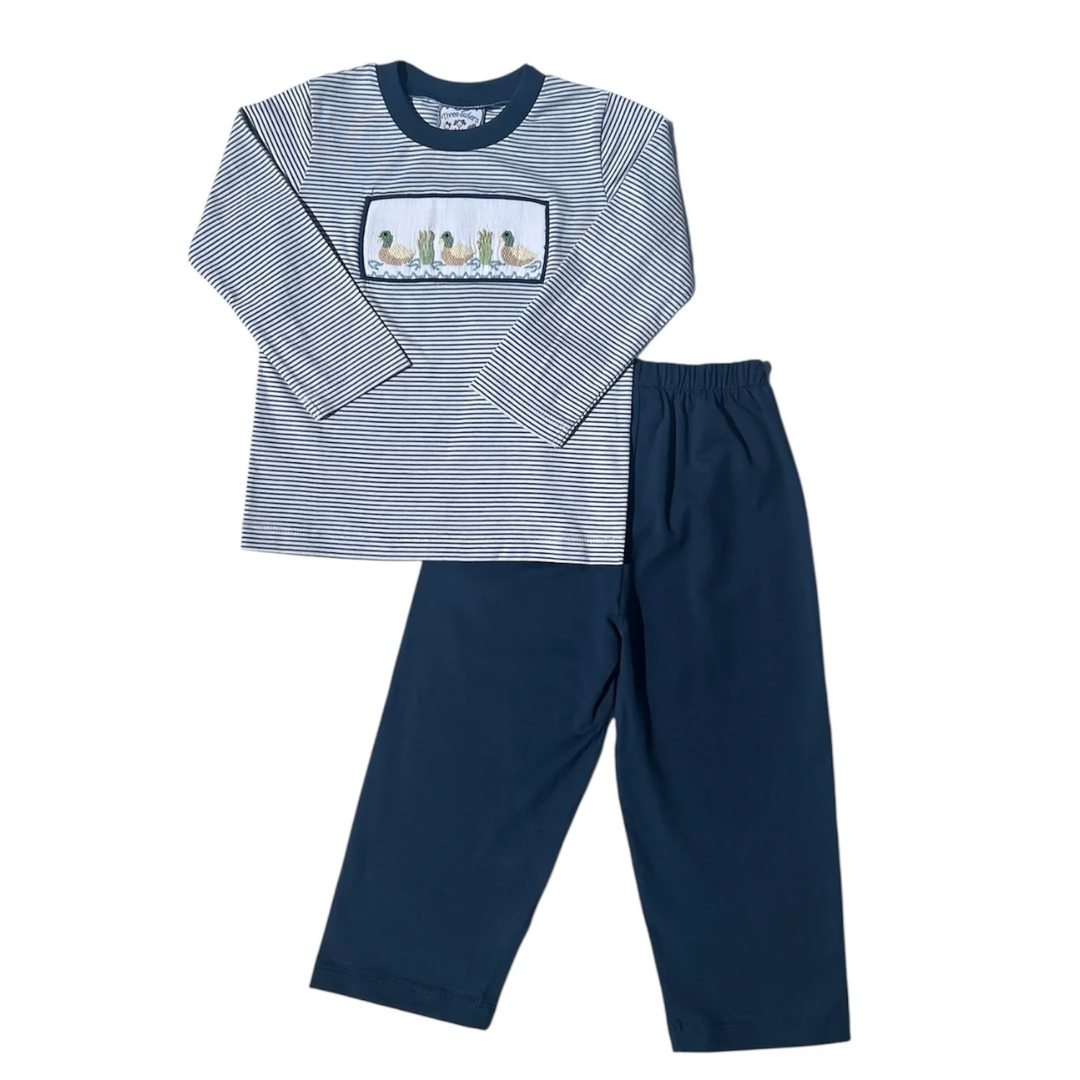 This cute two piece set includes a navy and white striped shirt with smocked mallard ducks along the chest and matching navy pants.