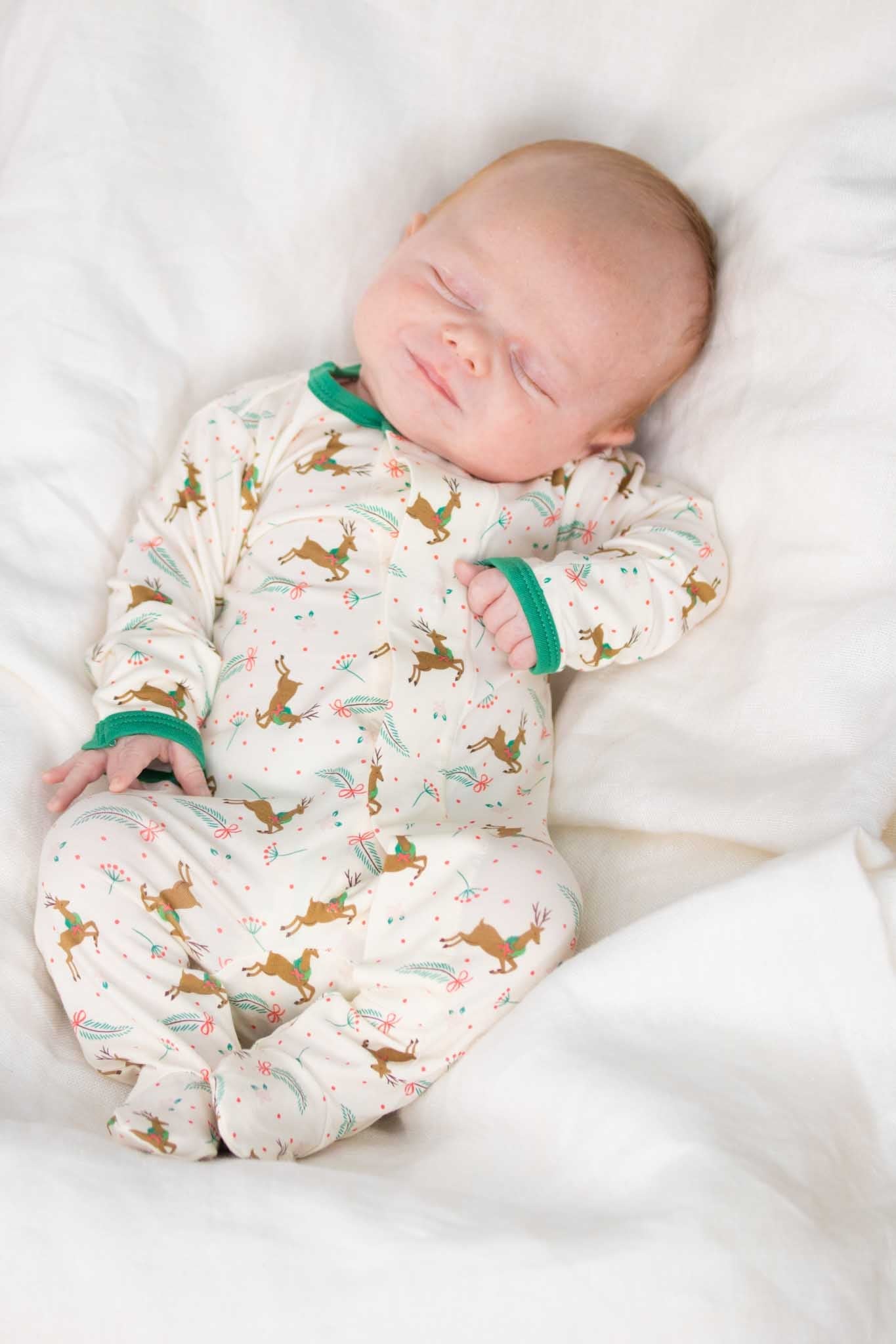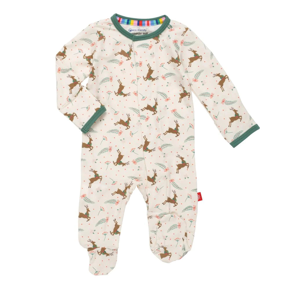 Our parent favorite footie is an everyday (and night) essential with magnetic closures that make dressing easy. Magnets are quick, quiet, and a lifesaver for middle-of-the-night changes. Eco-friendly TENCEL™ modal is silky soft, breathable, and gentle on sensitive skin. Temperature-regulating properties will keep warm in winter, you cool in summer, and oh-so comfortable year round. How perfect is this Christmas footie???!!! It features a creamy fabric with reindeer, mistletoe, and holly berries. This is a super cute gender neutral option as well.