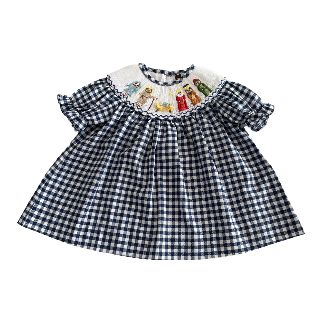 This adorable smocked bishop dress is a must have for this holiday season. It features a navy gingham print, puff sleeves, and smocked nativity scene. Coordinate with matching brother pant set.
