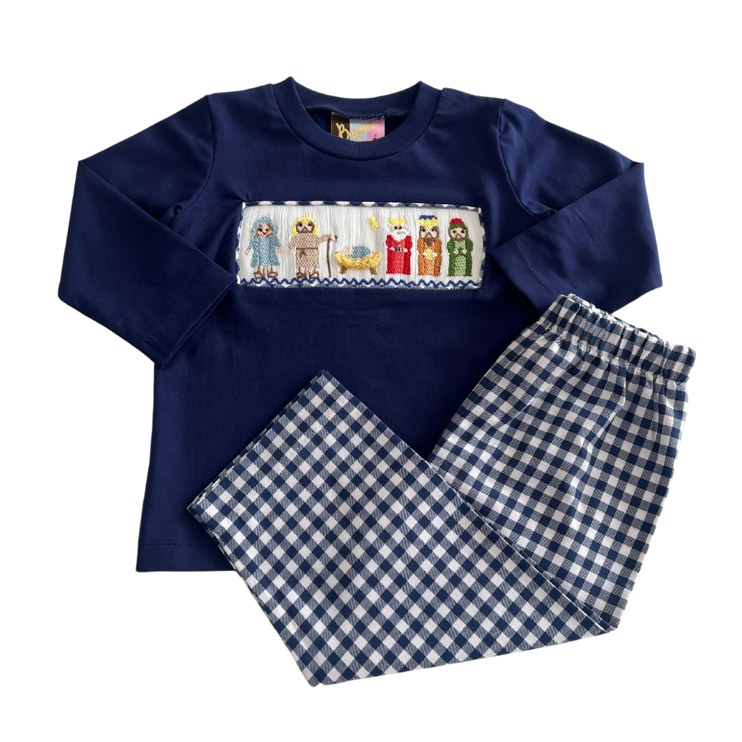 This adorable navy long sleeve shirt features a smocked nativity scene and navy gingham pants to match. This is a must have Christmas staple! Coordinate with matching girl Nativity smocked bishop dress.