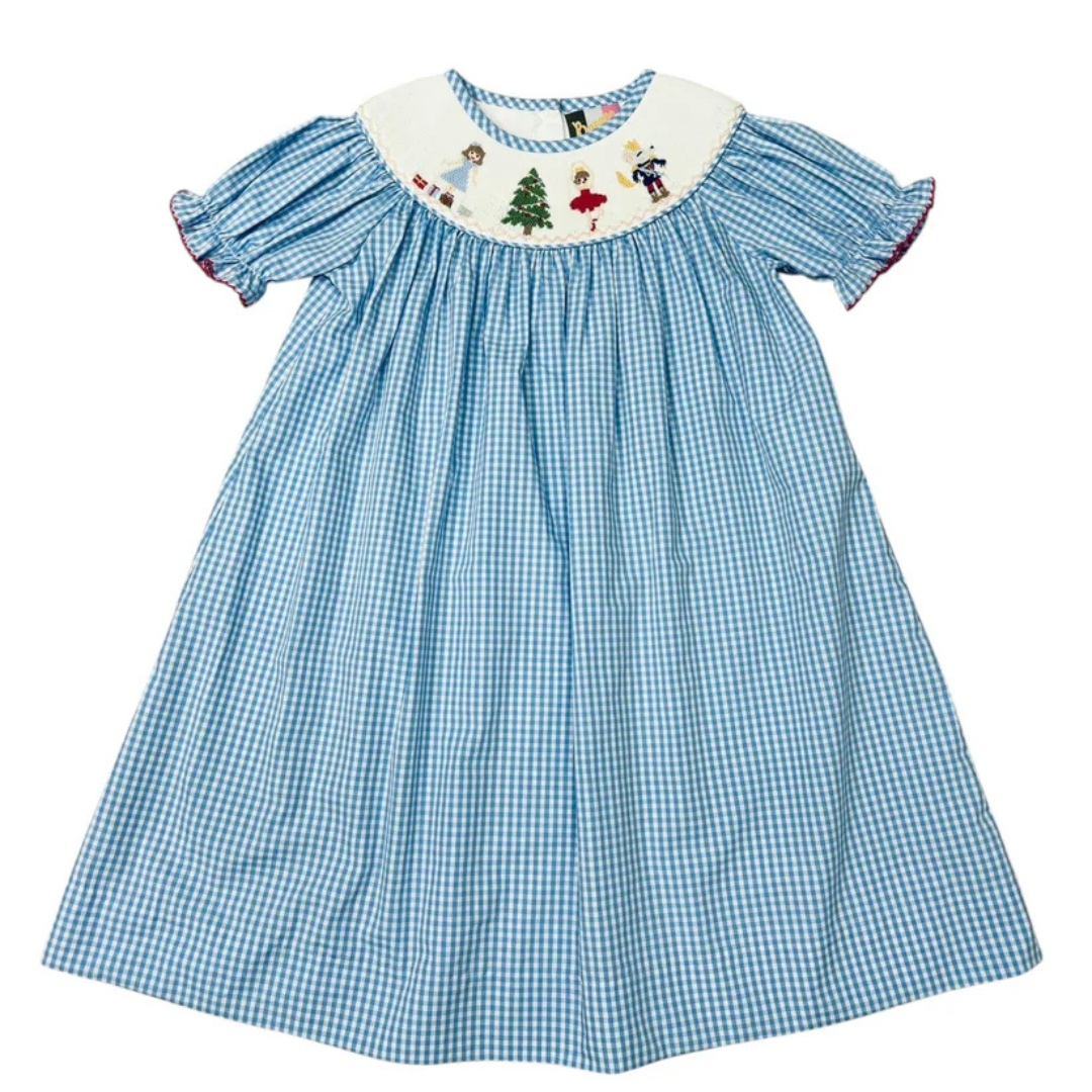 This is a charming girl's holiday dress with a classic, vintage-inspired design. The dress features a blue and white gingham check pattern and short puffed sleeves with red rickrack trim. The standout feature is the white yoke collar, beautifully embroidered with festive Nutcracker-themed characters, including Clara, the Nutcracker, a ballerina, and a Christmas tree. The dress has a full, gathered skirt that provides a comfortable and twirl-worthy fit, perfect for holiday parties, school performances, or family photos.