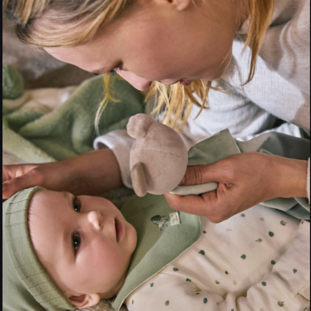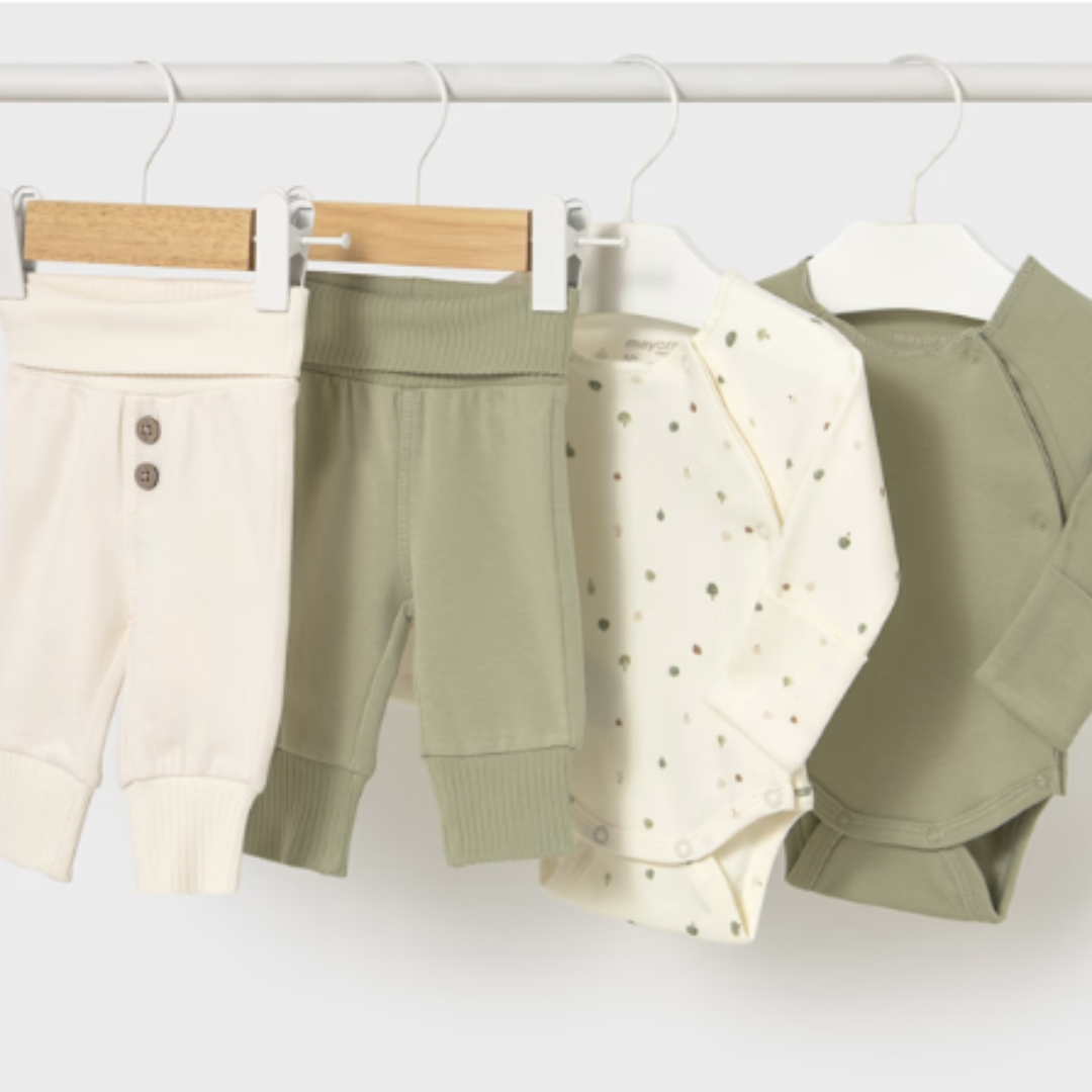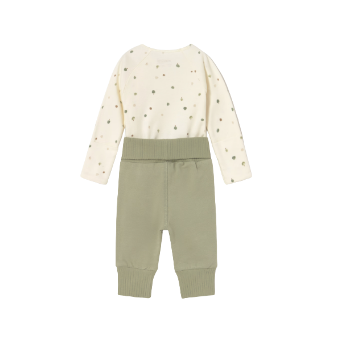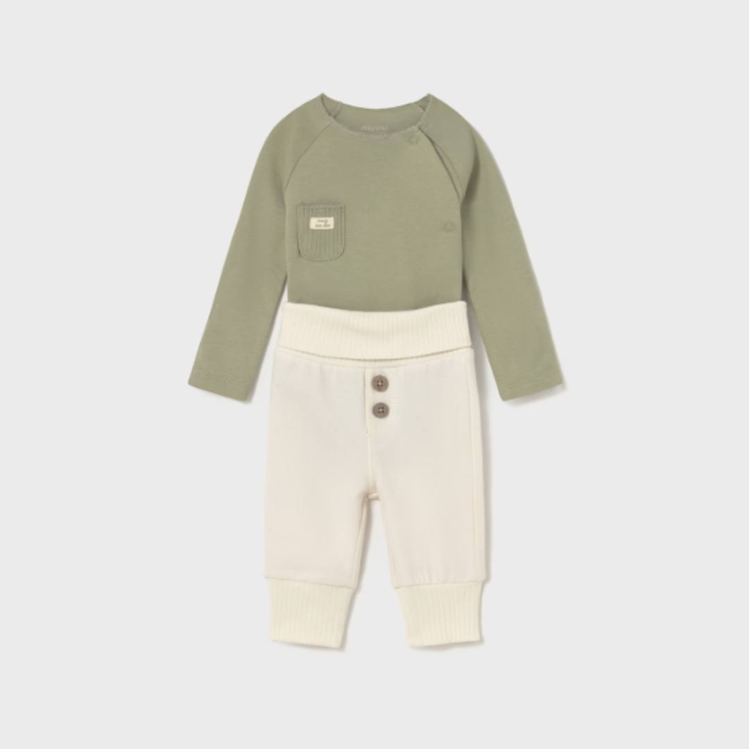 This Mayoral soft and Cozy set is perfect for fall. It includes an olive cuffed long-sleeved onesie with soft textured pants. The top has a small chest pocket with a "made with love" tag sewn on it, adding a little touch of detail. The pants are a soft, cream color with a ribbed waistband and two wooden buttons at the front for decoration.