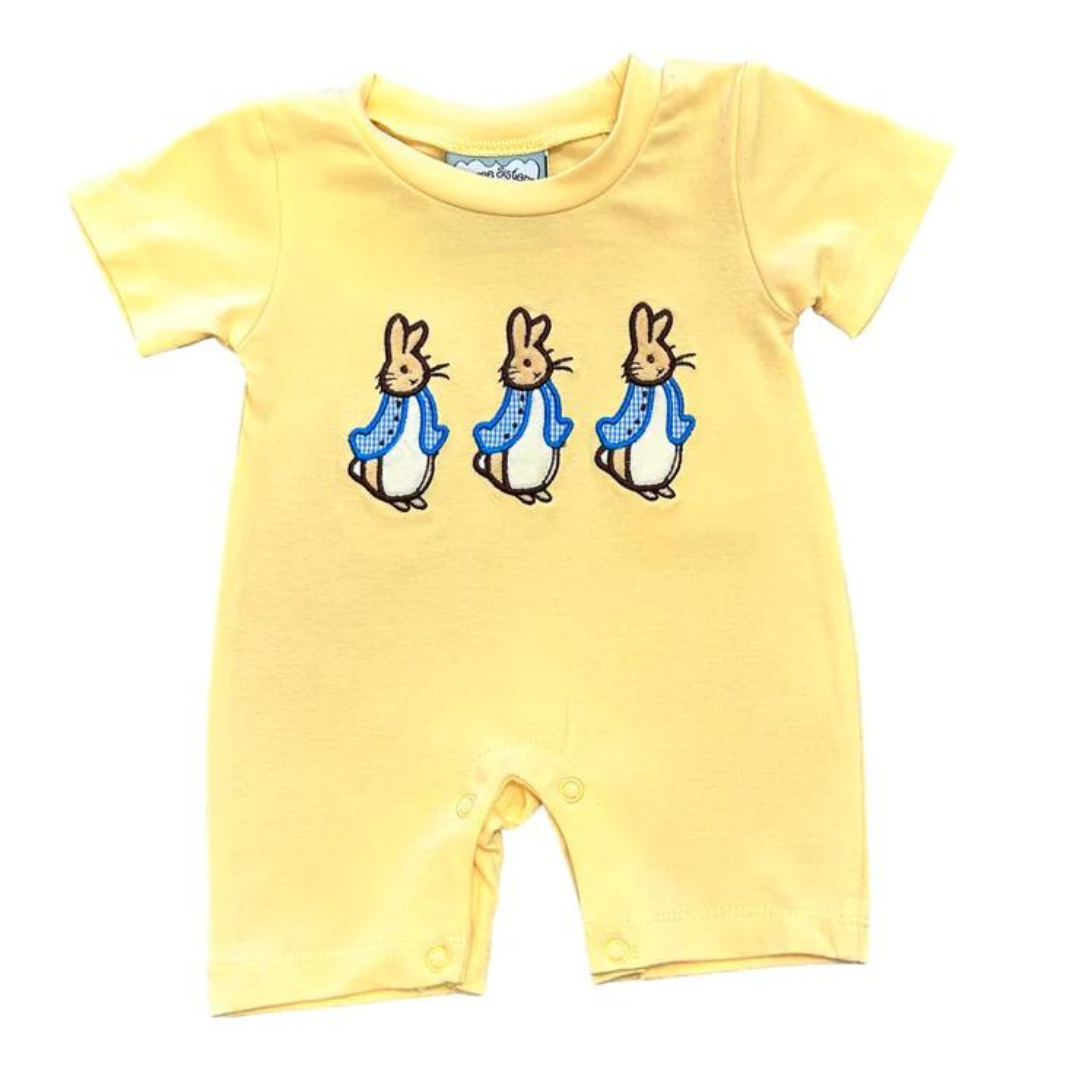 We love a one-piece outfit! This short sleeved yellow romper features a Peter Rabbit applique on the front and snaps at bottom for easy outfit & diaper changes. It is perfect for Easter and spring!