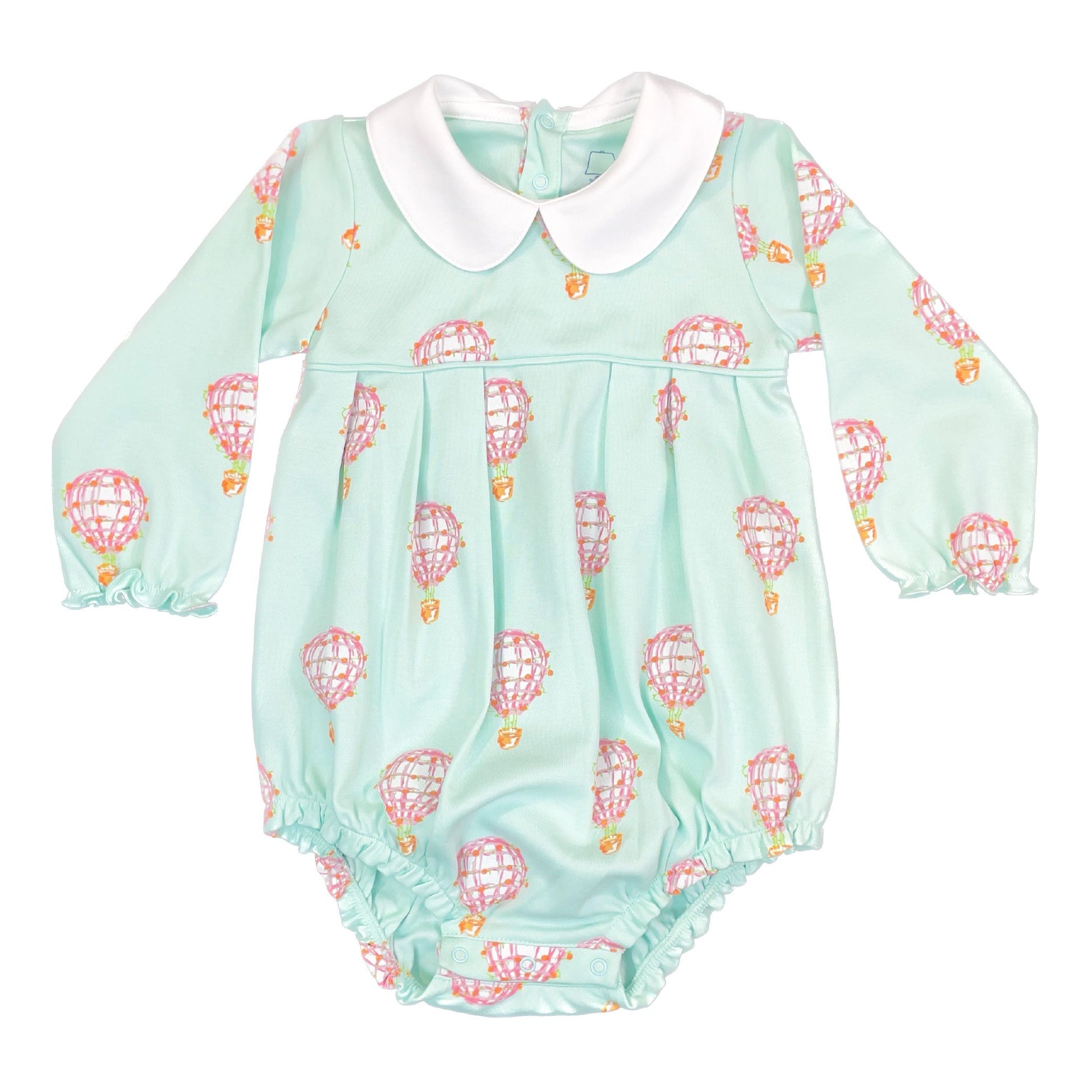 How adorable is this scalloped bubble?! This design is hand drawn by the Owners of Heyward House making it even more special to add to your baby's wardrobe for any season! The print features the cutest hot air balloon print with a scalloped neck line. It is on a mint background with pinks, oranges, and greens twirled into the hot air balloon. The sleeves and around the legs feature scrunching details. This timeless pink hot air balloon pattern is inspired by the calming and magical feeling of a hot air balloon floating in the sky as seen through the eyes of a child. This classic pattern is entwined by vines and flowers. Emphasizing the beauty of being outside and wondering, “where is this magical floating balloon going?