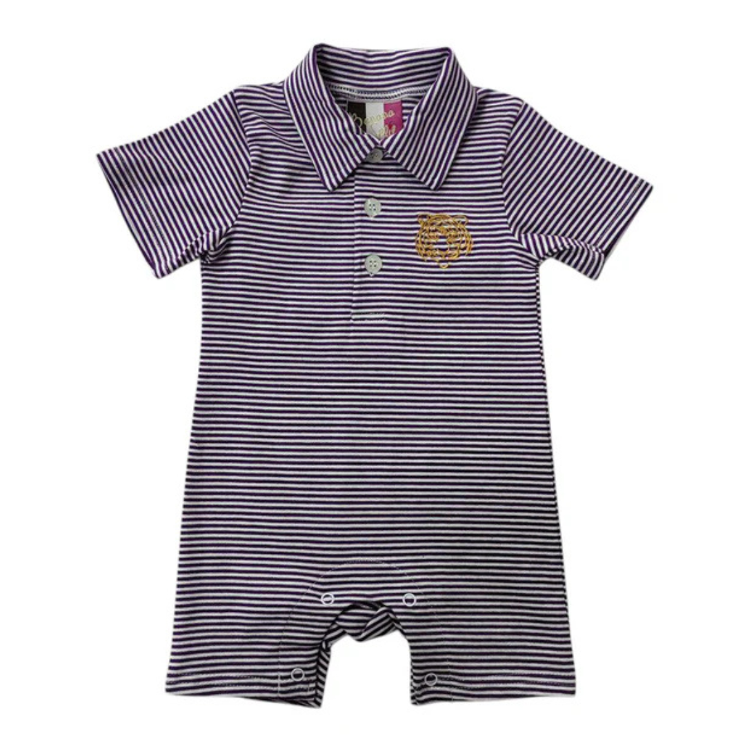 This is a short-sleeve baby romper designed with a classic polo shirt style. It features narrow horizontal purple and white stripes, a structured collar, and a three-button placket on the chest for easy dressing. An embroidered orange and purple tiger is stitched on the left chest area, adding a sporty and polished touch. The romper has snap closures along the inseam for convenient diaper changes. Made from soft, breathable fabric, this romper is both stylish and comfortable—perfect for everyday wear or casual outings.