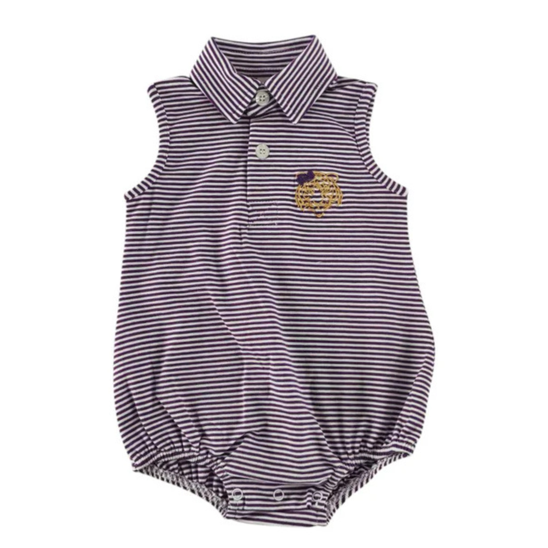 This is a sleeveless bubble featuring a classic polo-style collar and a front button placket with two buttons. The fabric is patterned with narrow horizontal purple and white stripes. An embroidered tiger in orange and purple is stitched on the left chest area, adding a preppy touch. The leg openings are elasticized for comfort and a snug fit, and the bottom has snap closures for easy diaper changes. Made from a soft, breathable material, this romper combines style and practicality for everyday wear.
