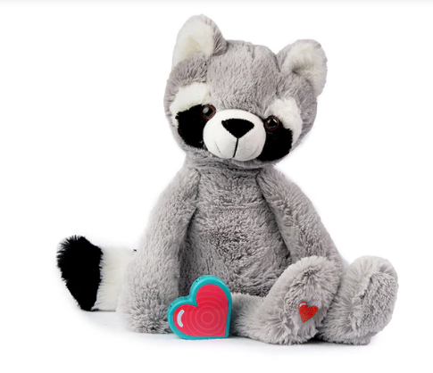 The vintage Raccoon kit Includes a 13- 15" stuffed Raccoon and an easy-to-use heart-shaped recorder. The Raccoon is perfect to cuddle, made with a soft fleece-like material with poly fiber stuffing and a velcro closure in the back where the recorded heartbeat or message is secured.