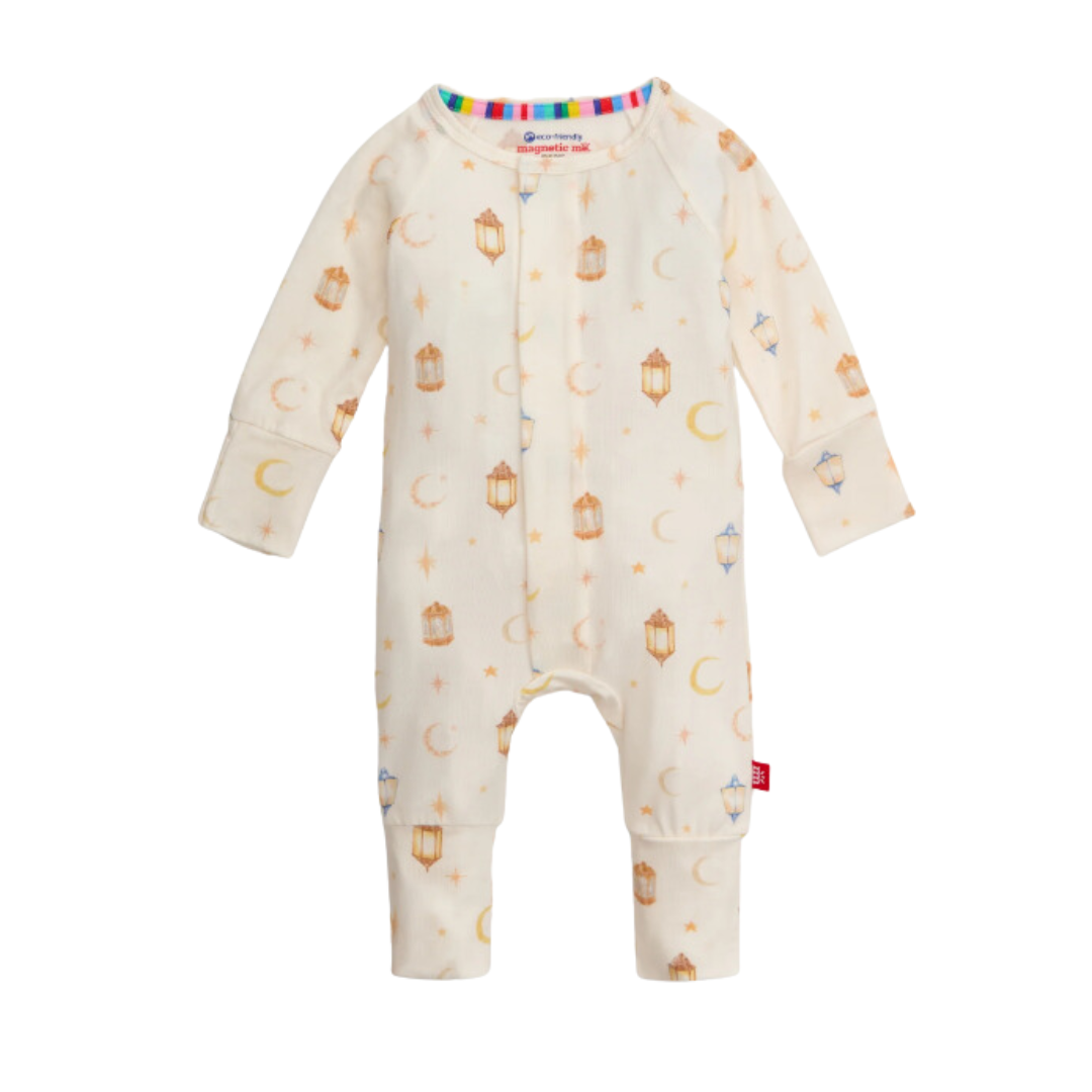 Meet our grow with me convertible coverall, a one-piece that lets you adjust its features as your baby grows. magnetic closures ensure quick and quiet changes, and foldover cuffs for hands and feet extend the length and life of the coverall. made of eco-friendly TENCEL™ modal that's silky soft, breathable, and gentle on sensitive skin, this is one piece of clothing that baby won’t outgrow in the blink of an eye. It features enchanted lanterns in a soft starry moonlit night.