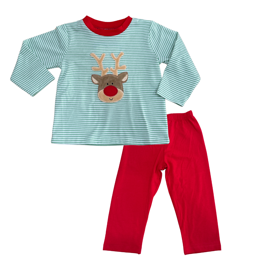 This super cute set features a green and white striped top with a reindeer applique on the front and red trim around the neck and matching red pants. Coordinate with matching little sister outfit!