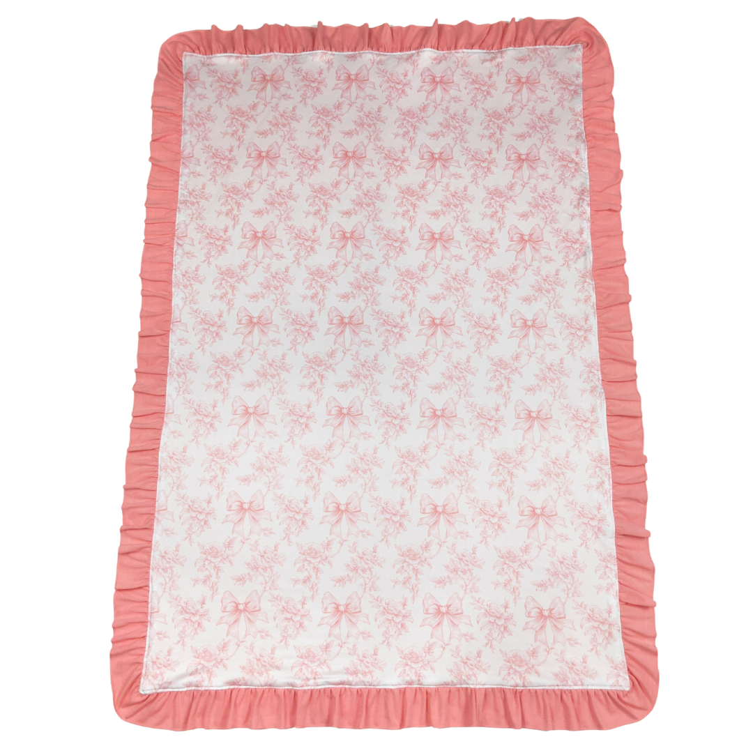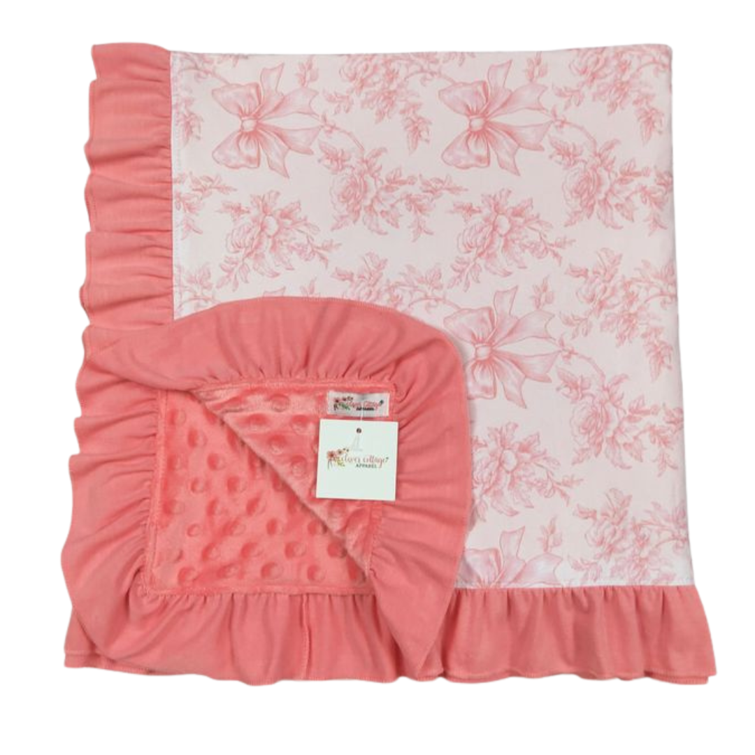 This minky baby blanket is a must have item for every newborn. It is the perfect baby shower gift, and will quickly become a staple for every day use. A perfect blanket that fits through the toddler years: (car seat, stroller, or playtime). It measures 29x43 inches and features an elegant bow print with ruffled edges.