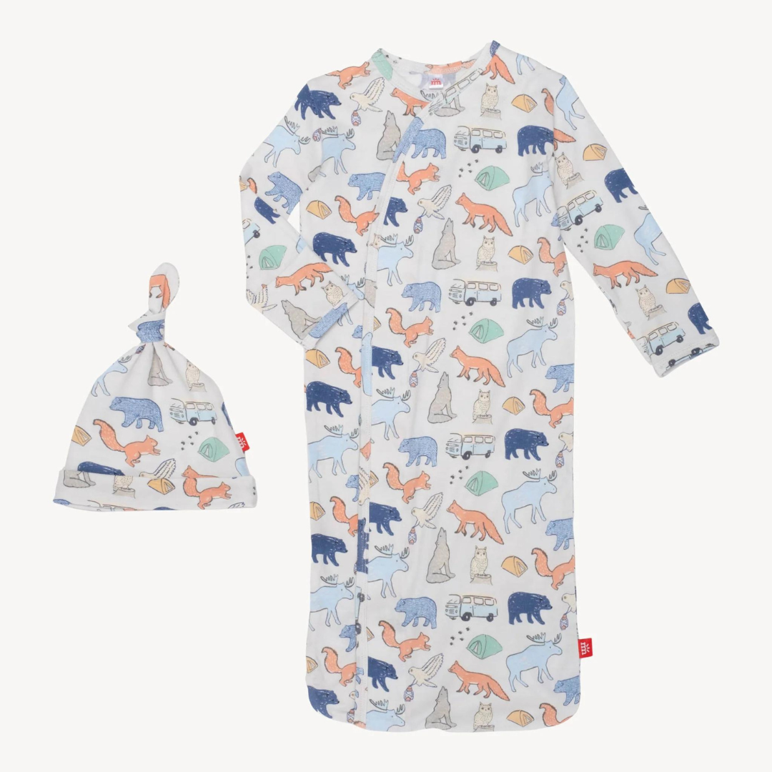 The cozy sleeper gown + hat set is a wardrobe staple for newborns who require constant diaper changes (aka all of them). with magnets down the front, baby stays in the gown during the diaper switcheroo: separate magnets, put on a freshy, click magnets, done. other amazing features: eco-friendly TENCEL™ modal fabric and built-in mitten cuffs.