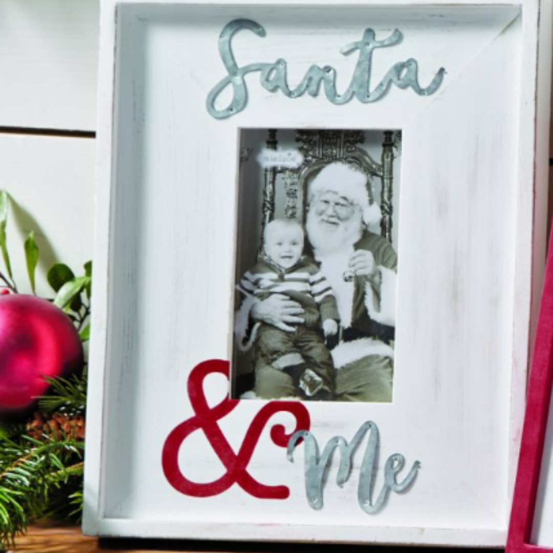 Wood white washed 8x10 frame with metal and red lettering saying "Santa & Me". Holds 4x6 photo and can be hung or table top with provided wooden dowel.