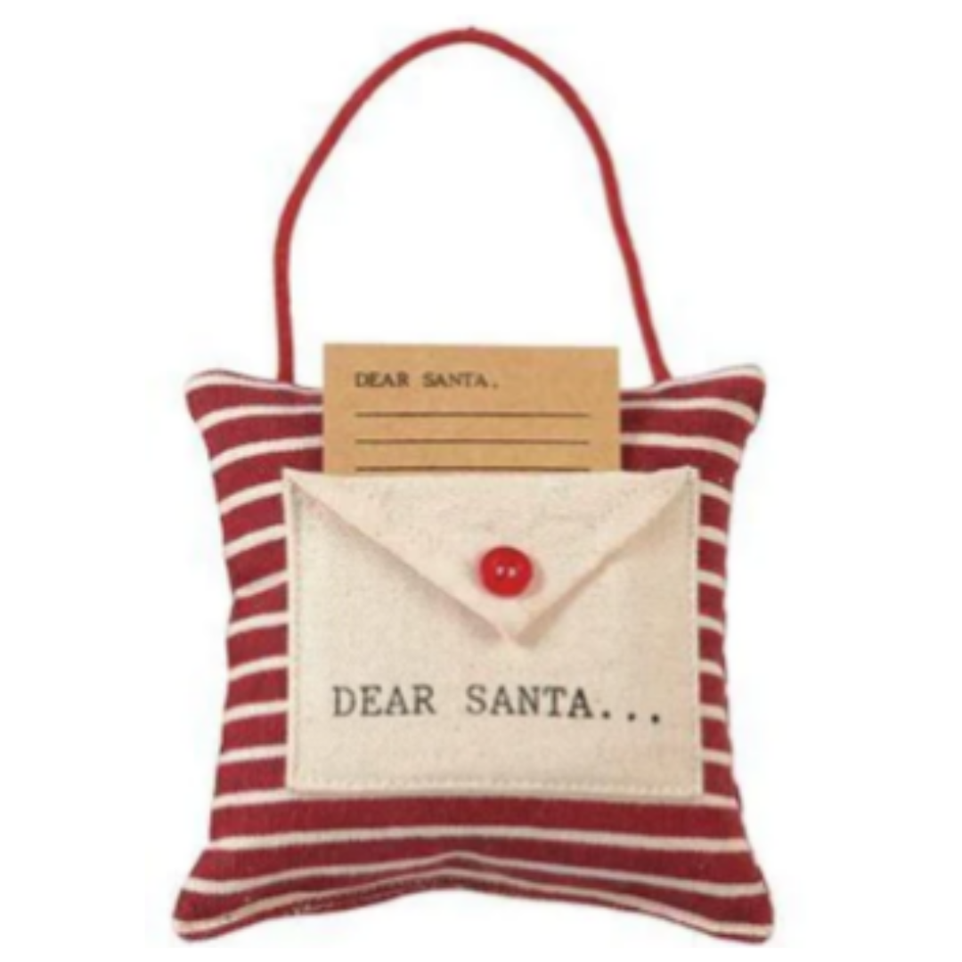 Stuffed tartan, grainsack or striped cotton pillow features twisted rope door hanger and canvas appliqued envelope pocket with printed sentiment and button closure. Pairs with personal craft letter to Santa.