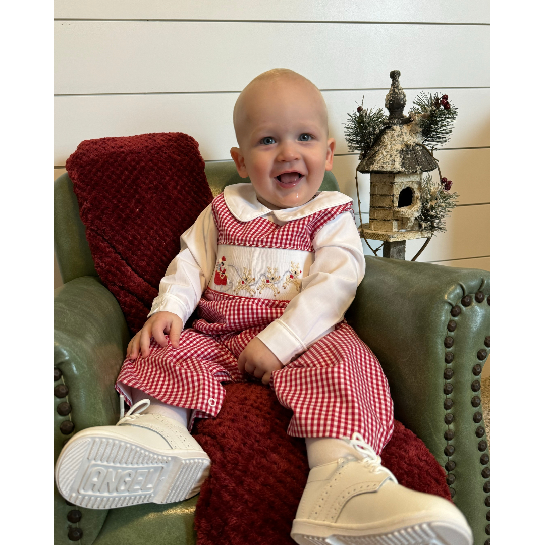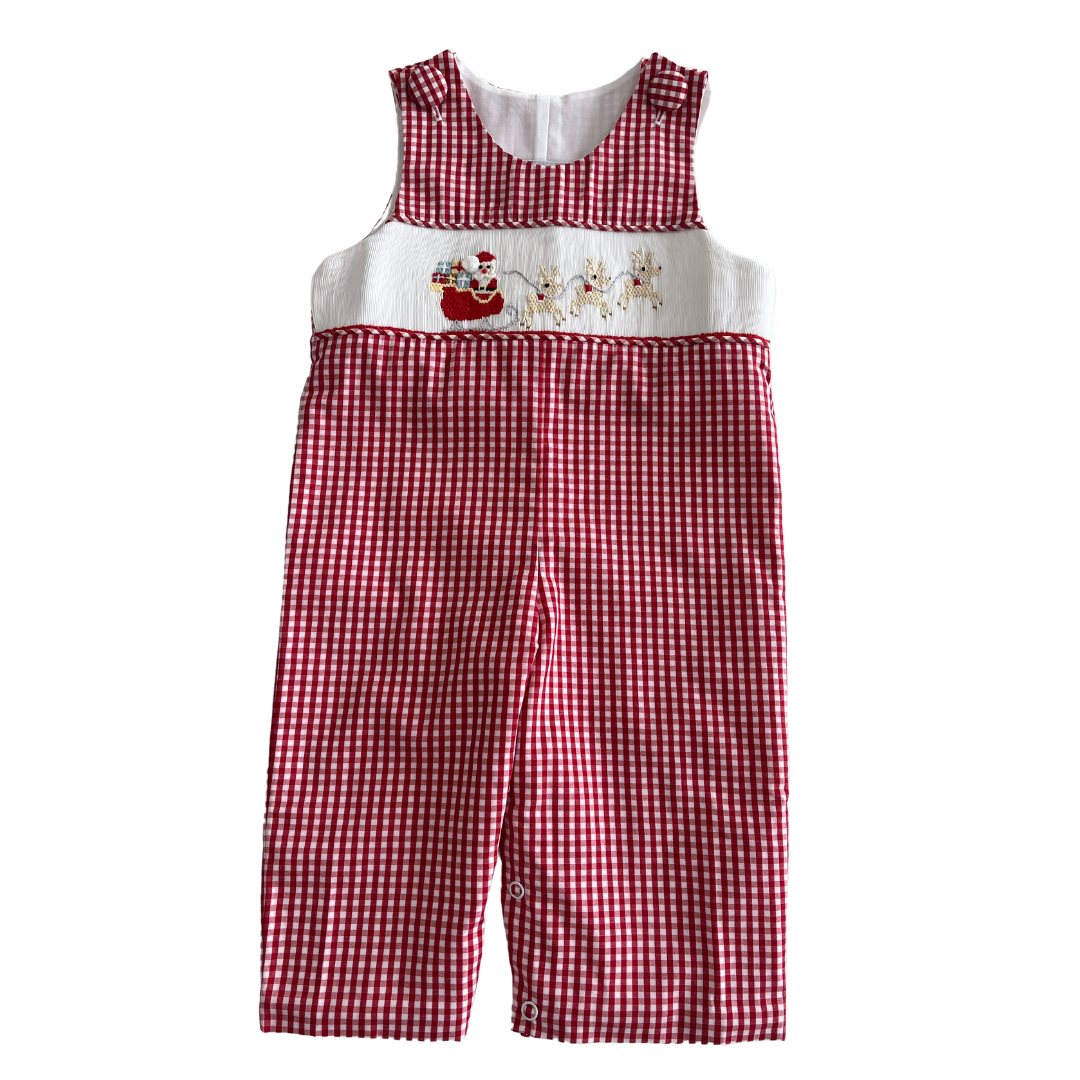 This adorable smocked longall is a must have for this holiday season. It features a red gingham print, buttons on shoulder and bottom for easy changing, and smocked Santa's sleigh with his reindeer. Coordinate with matching sister bishop dress.