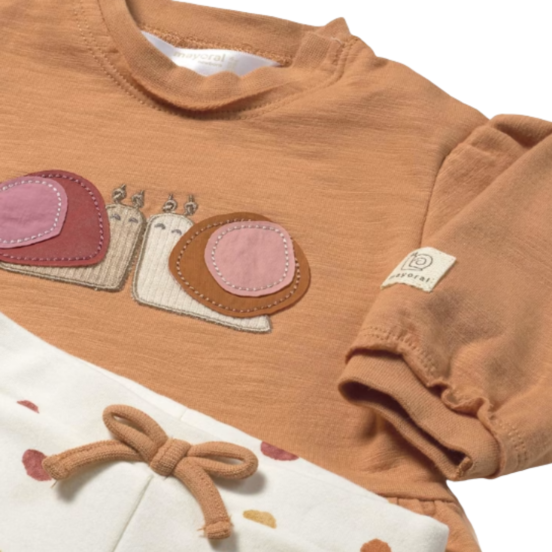 Long sleeved Sweatshirt for baby girl with Round neckline. Snap button fastening on the shoulder to allow the garment to be put on easily. Decorative Snail applique in rust, pink and tan accents front with decorative ruffle.