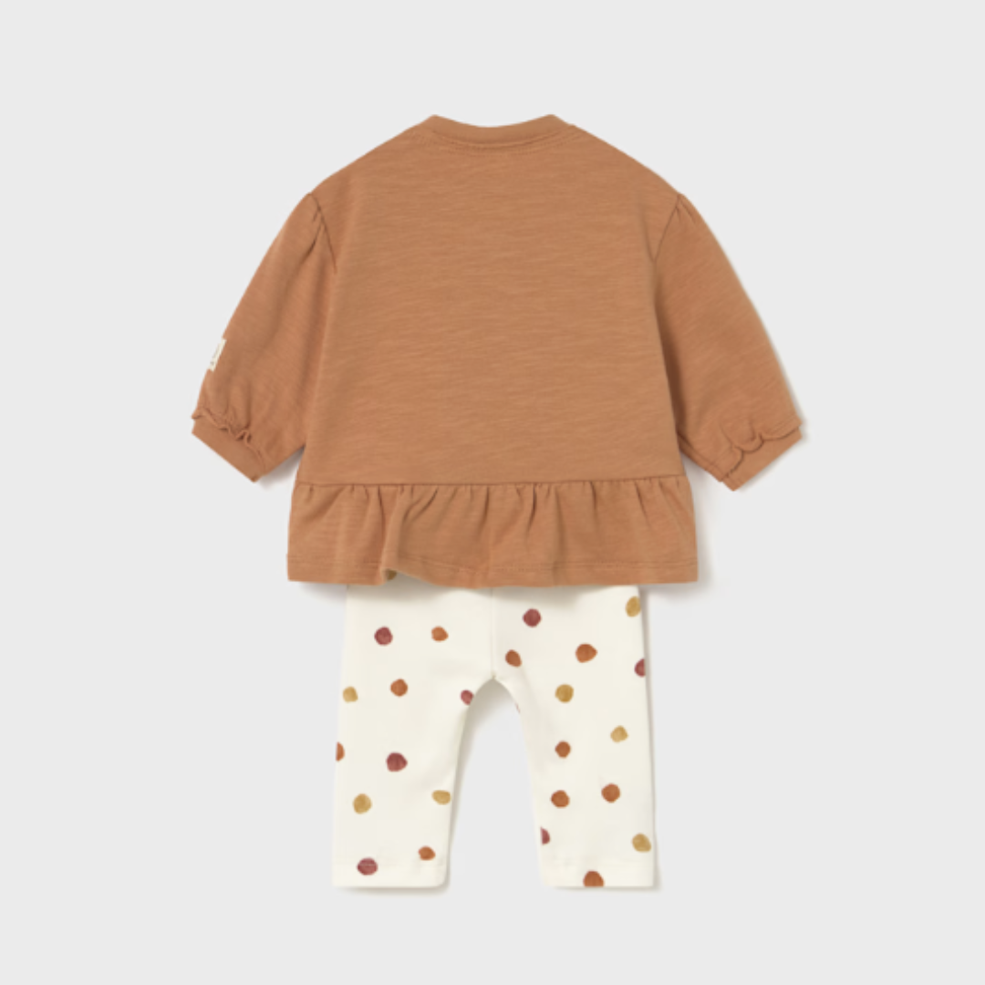 Cream with rust and mustard polka dots leggings. Elasticated waistband with bow drawstring in center.