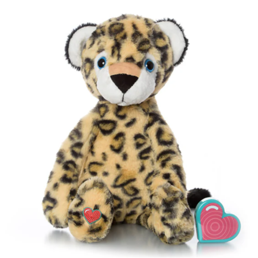 The Vintage Leopard Kit includes a 15" stuffed leopard and an easy-to-use heart-shaped recorder. The leopard is perfect to cuddle, made with a soft fleece-like material with poly fiber stuffing and a velcro closure in the back where the recorded heartbeat or message is secured.