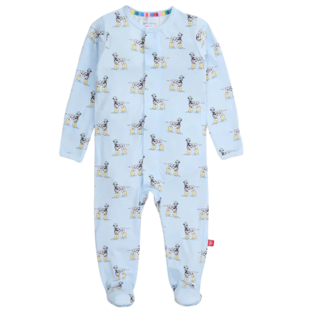 Our modal Magnetic Footie, designed with magnetic closures, is a quick and quiet lifesaver for all-day and middle-of-the-night diaper changes—that's up to 12 times a day (!). Made from sustainable modal, it's a silky-soft and temperature-regulating sleeper to keep your little one comfy from head to toe. This fun print features dalmatians wearing yellow rain boots!