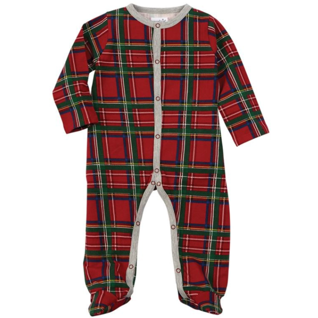Your little one will be snug as bug in this jersey footed sleeper this season, featuring a red tartan print, contrast gray ribbed binding and a faux bum flap. Finished with front bodice and inner leg snap closures.