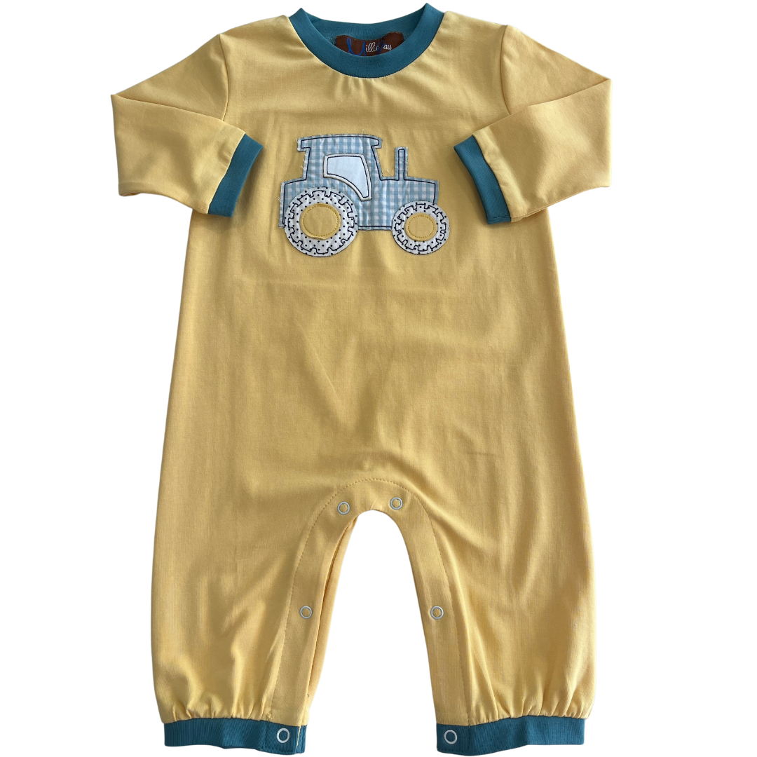 Adorable pastel yellow long sleeve romper that features an embroidered applique of a tractor and teal trim around the neck, arms, and legs. It is has snaps along the bottom for easy changing. This is a must have fall staple!