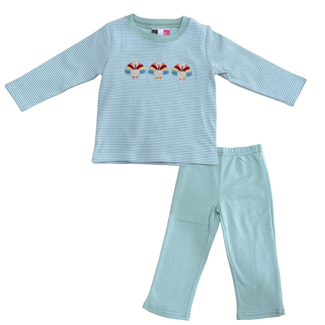 This is a festive two-piece toddler boy's outfit, perfect for Thanksgiving or fall celebrations. The set includes a long-sleeve top and coordinating pants. The top features green and white horizontal stripes with a solid green crew neckline. A trio of embroidered turkeys is centered on the chest, adding a playful, seasonal touch. The solid green pants complement the top and offer a comfortable fit for all-day wear. Made from soft, breathable fabric, this outfit combines style and comfort for your little one's autumn festivities. Coordinate with matching sibling outfits!