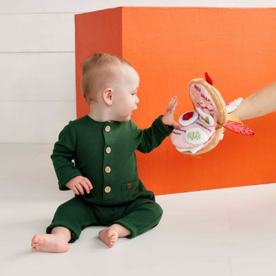Soft minky turkey puppet book includes "gobble" sound chip, illustrated story and matching pieces for interactive play. This is a perfect toy for your little one during fall festivities.