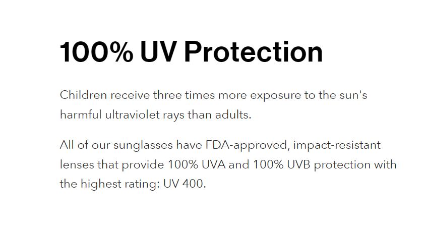 100% UVA and 100% UVB protection. FDA-approved, impact-resistant lenses with the highest protection rating: UV400.