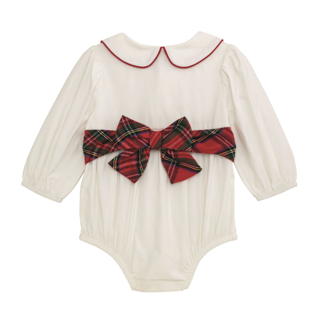 This adorable cotton poplin long sleeve bubble features woven tartan covered chest buttons, back tartan bow and contrast piping at waist and Peter Pan collar. It is perfect for Christmas time!