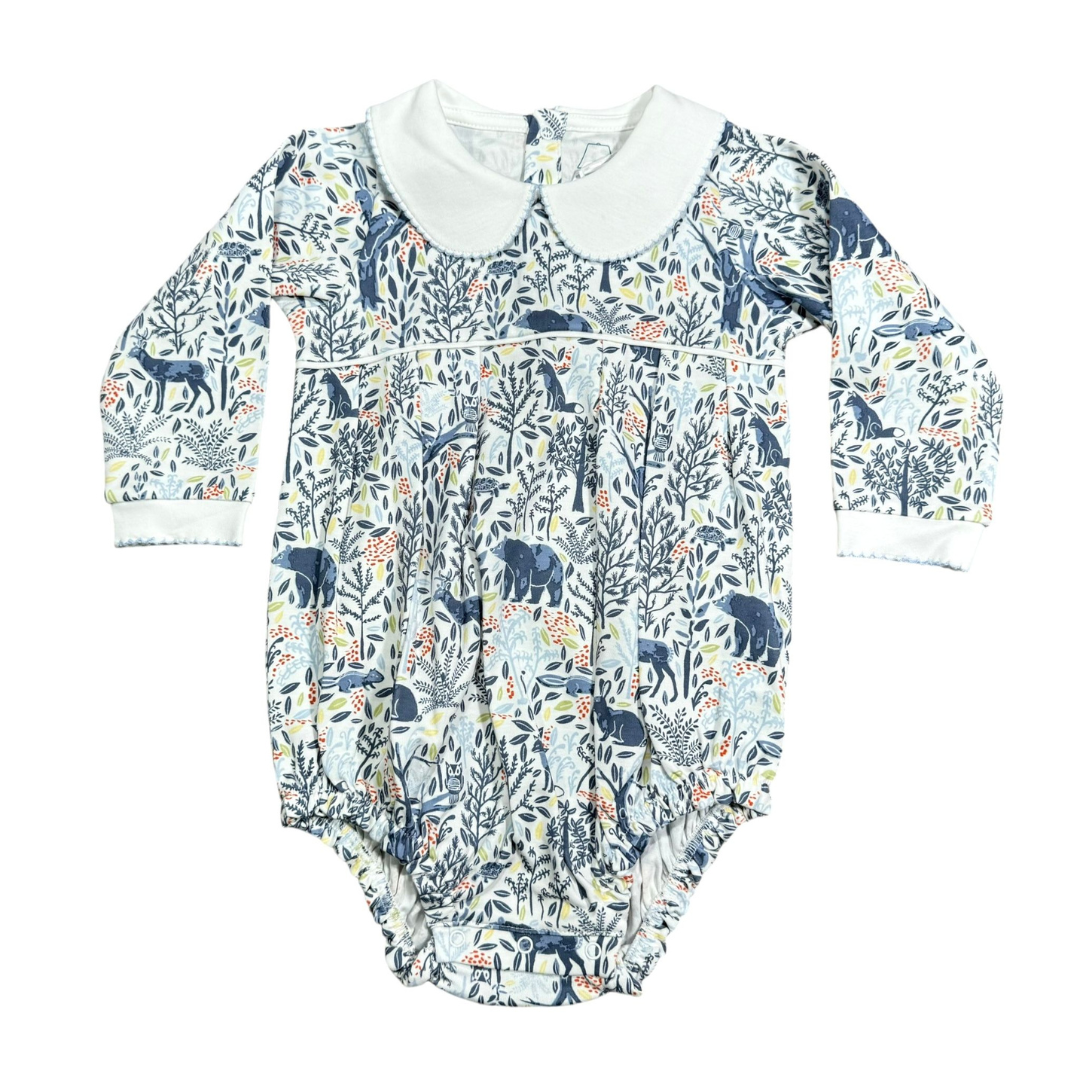 This classic Long-sleeved pleated bubble is a wonderful option for all sorts of elegant play! Each bubble features the sweetest ruffled sleeves and exquisite details in every stitch! It features a stoic woodland animal print that is perfect for the fall and winter season.