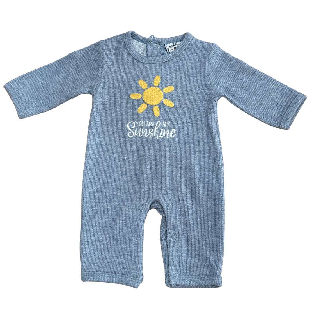 This super soft chenille like gray romper features an embroidered yellow sun with you are my sunshine in white.